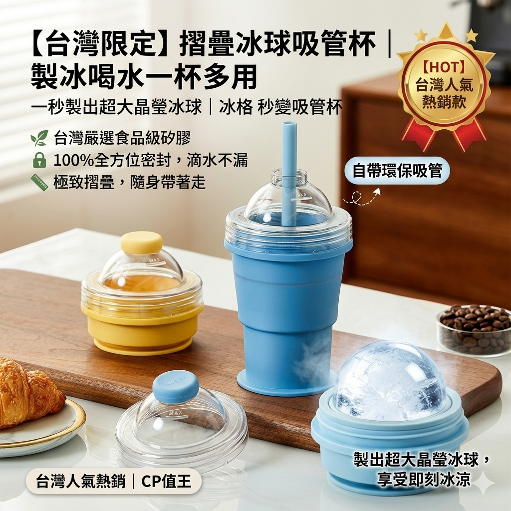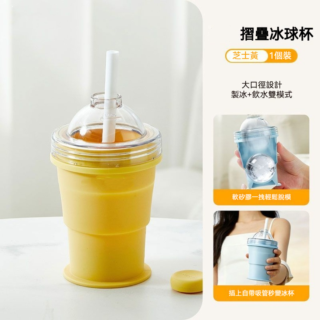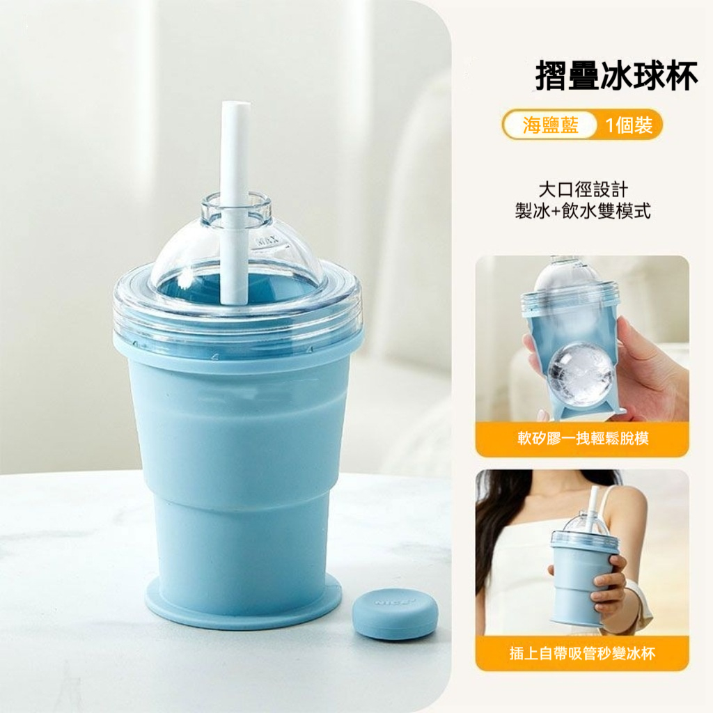 【懶人折疊冰球杯】冰格秒變吸管杯一折製冰球•展開直接喝食品級矽膠輕拽脫模6cm超大冰球鎖住風味100%密封 防漏·自带環保吸管極致折疊隨身帶·一杯雙用CP值王!